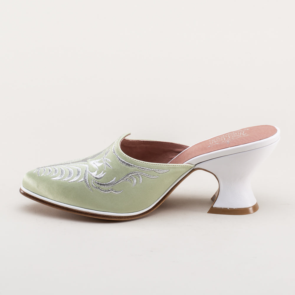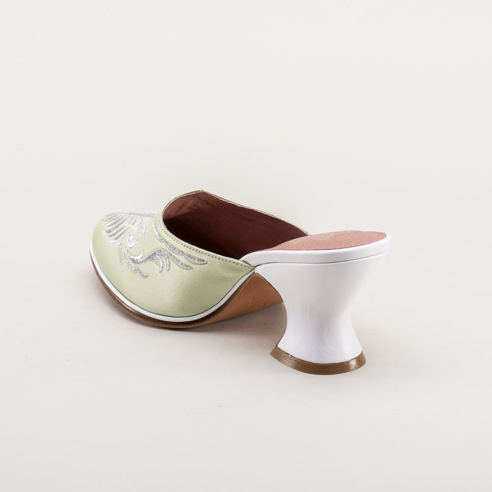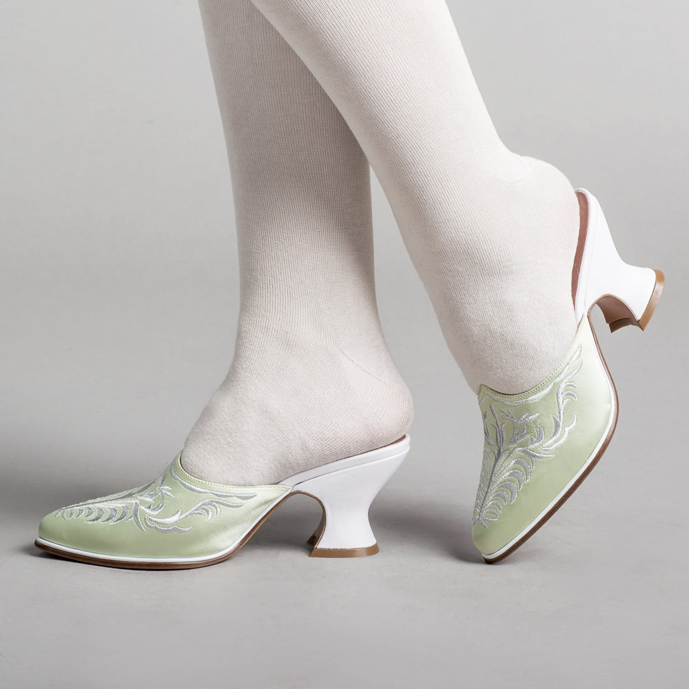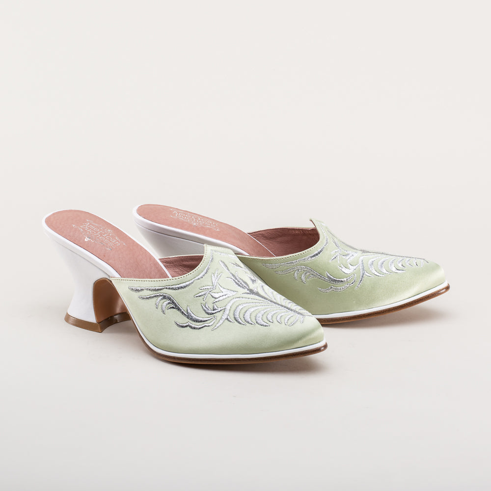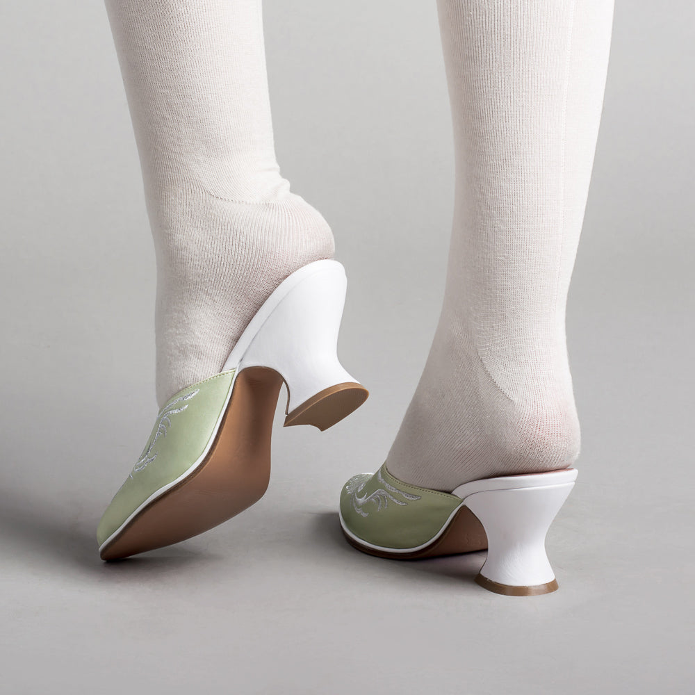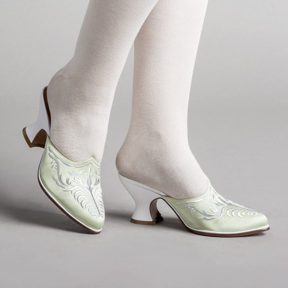 Antoinette 18th century mules present a gorgeous opulence in fancy footwear for your Georgian era impressions. Correct for c. 1700 - 1770s, these elegant backless heeled slippers are the ideal choice for fancy gowns fit for Versailles, with a superbly balanced French heel, leather lining for easy walking, and a softly pointed toe.