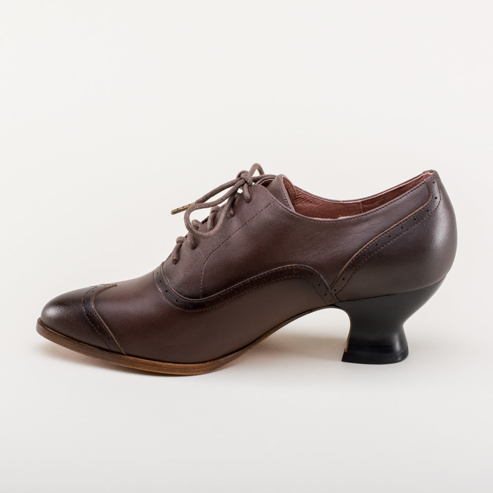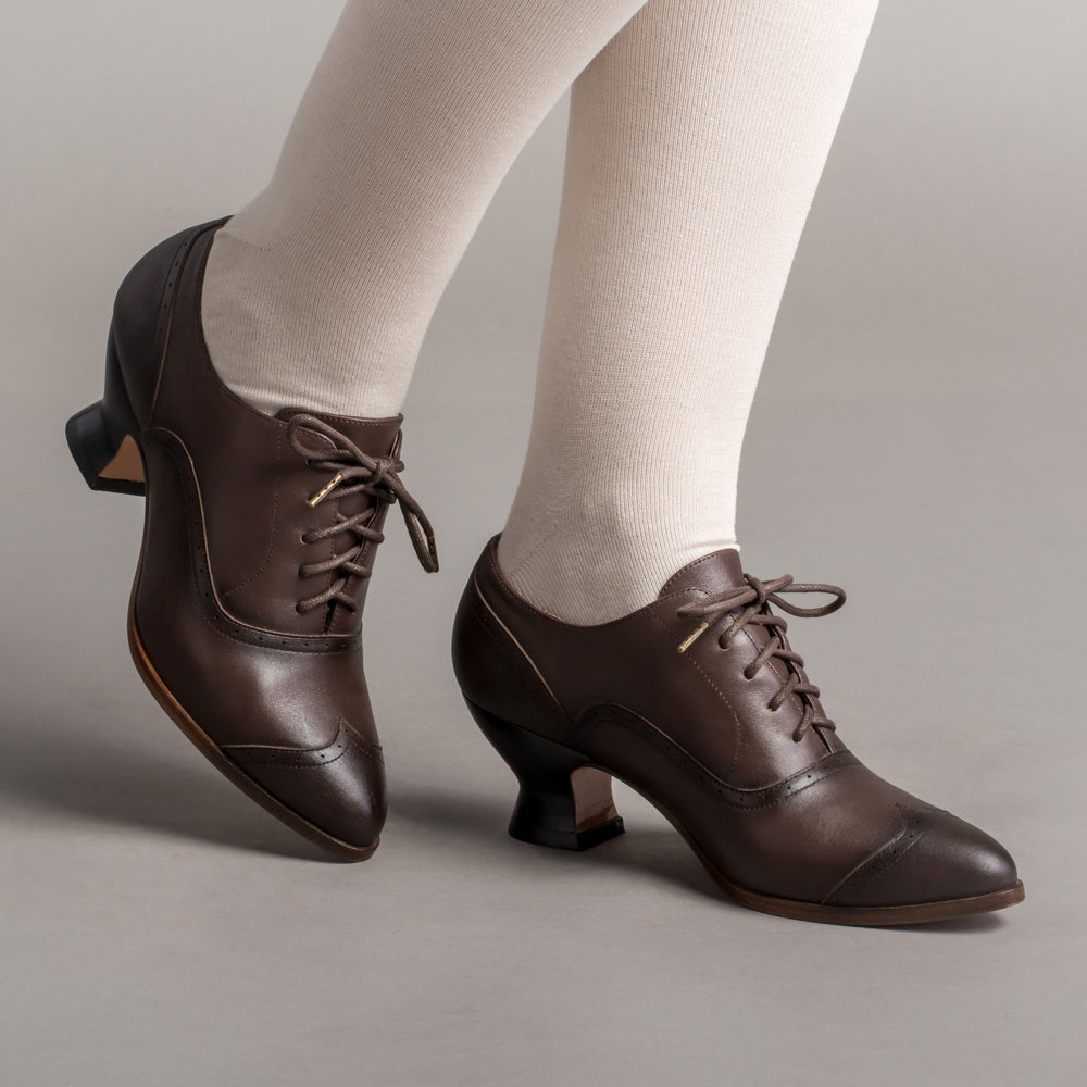 Whether you are fighting for the right to vote or exercising that right today, the Londoner Edwardian Oxfords will keep you on your feet, on the go, comfortably, and chic all day long. Made of real leather with leather lining and soles, these beautiful reproduction Edwardian oxford shoes feature an adjustable lace-up closure, eyecatching broguing on the uppers, and a stacked-look French heel. Paired with walking skirts of the 1910s or wide-legged trousers of the 2020s, the timeless Londoner oxfords are an excellent choice.