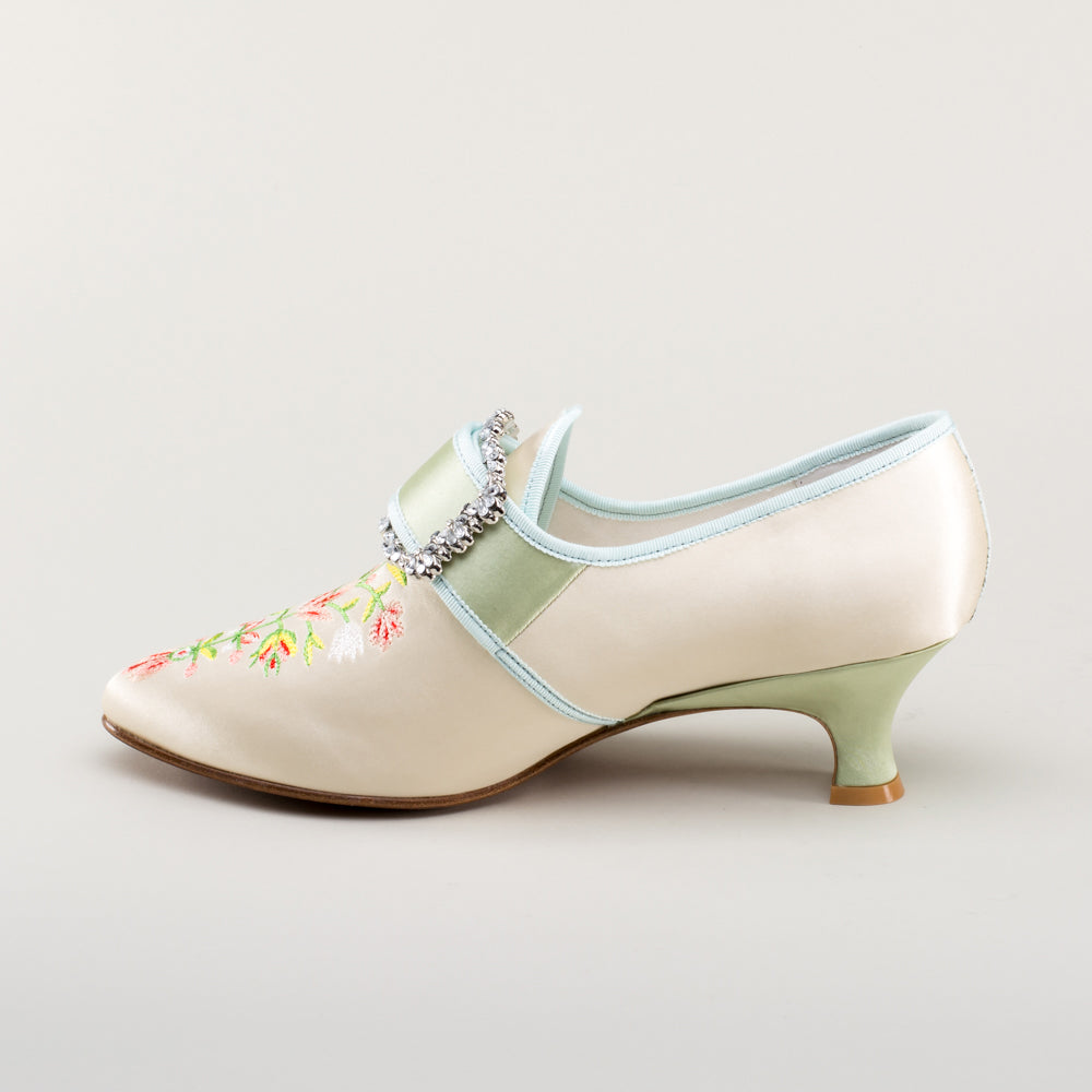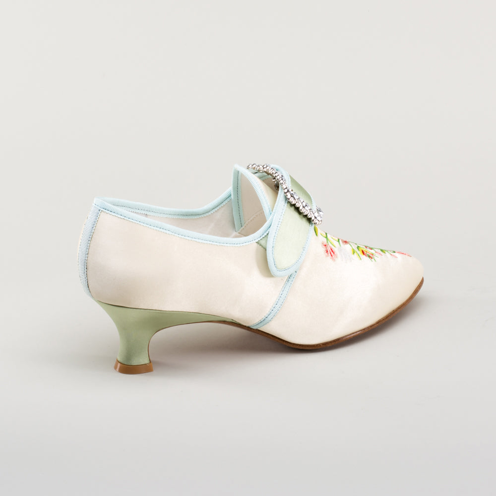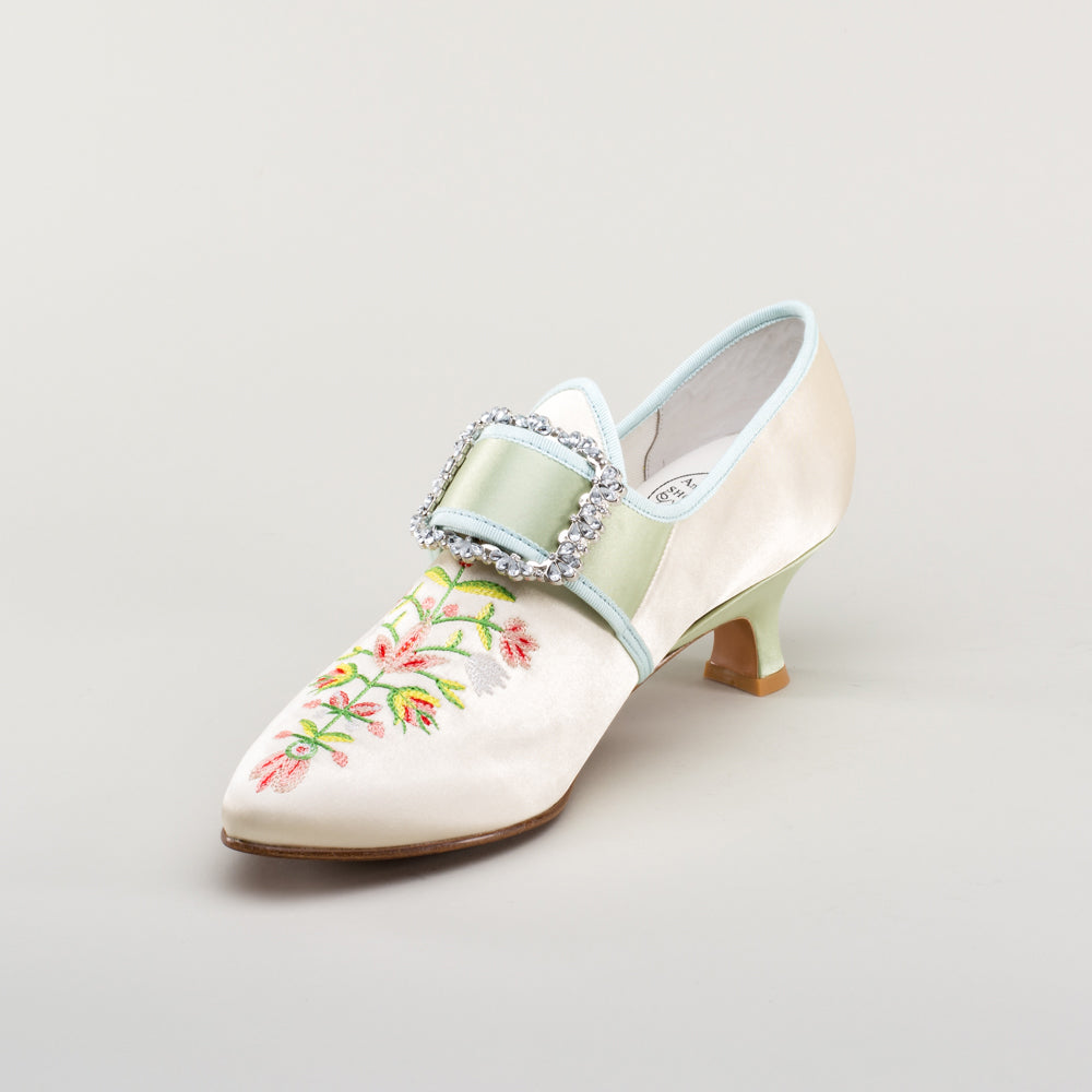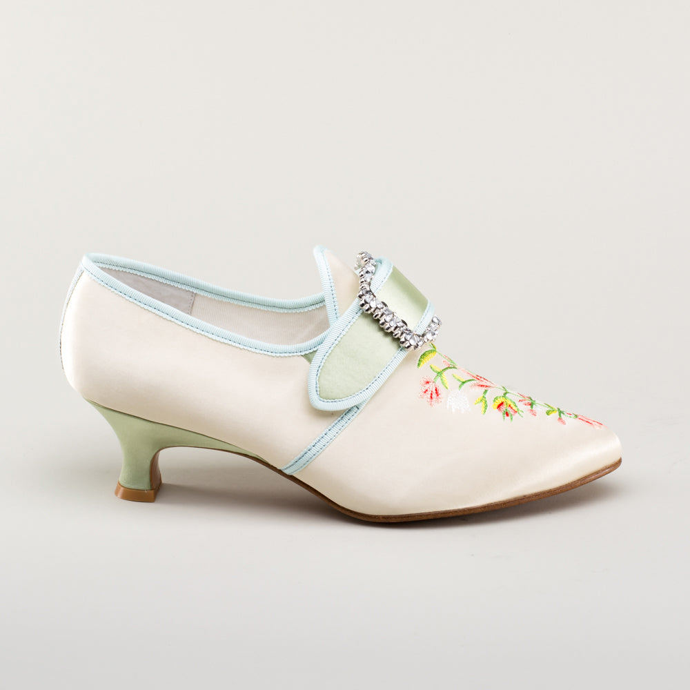 Step back in time with the delicious Primrose 18th century shoes. This authentic embroidered satin design has been recreated in collaboration with The Bata Shoe Museum, capturing the look and feel of the original shoes from 1770s-1790s. Made on the Dunmore last and 2 inch / 5 cm heel, you can be sure that style doesn't mean sacrificing comfort.