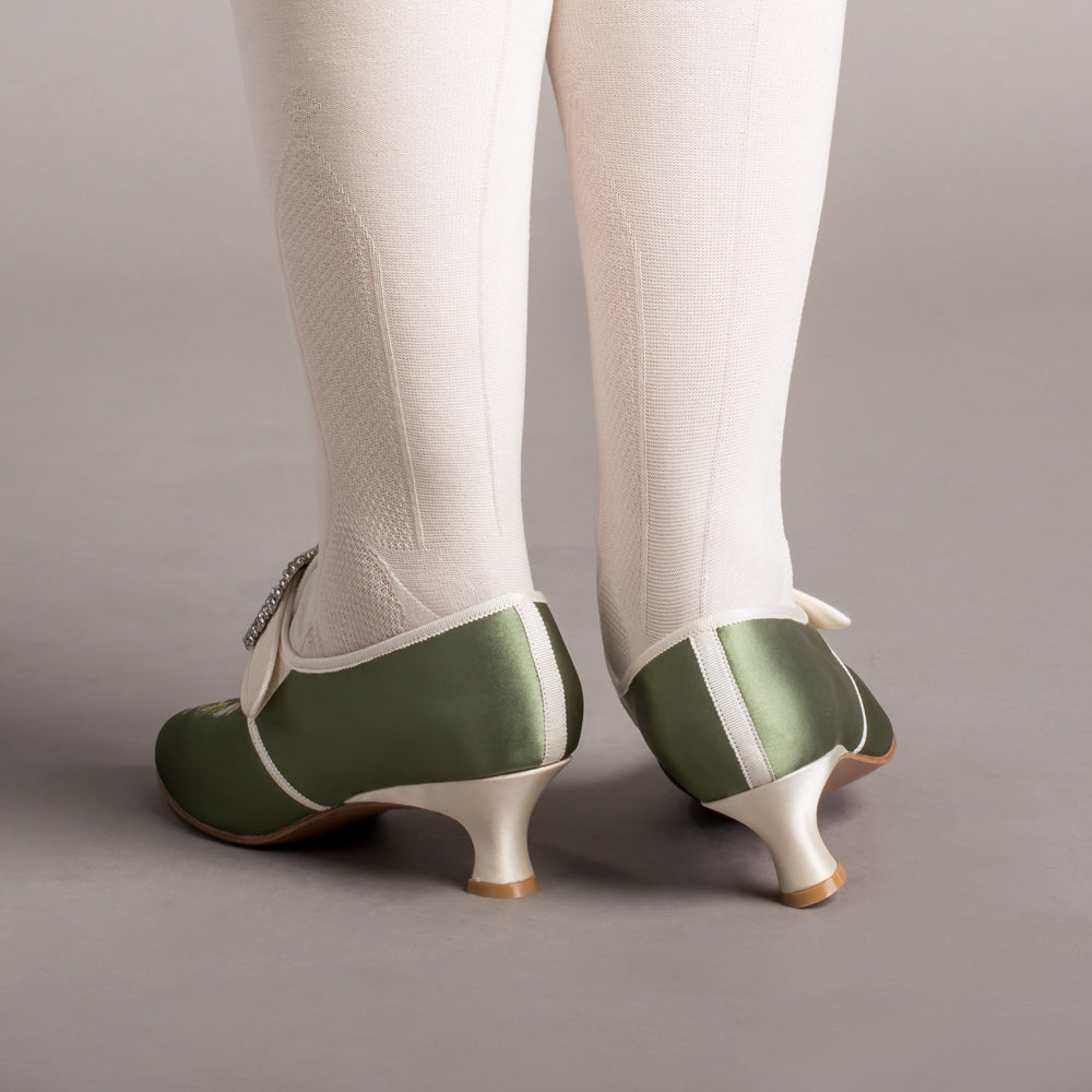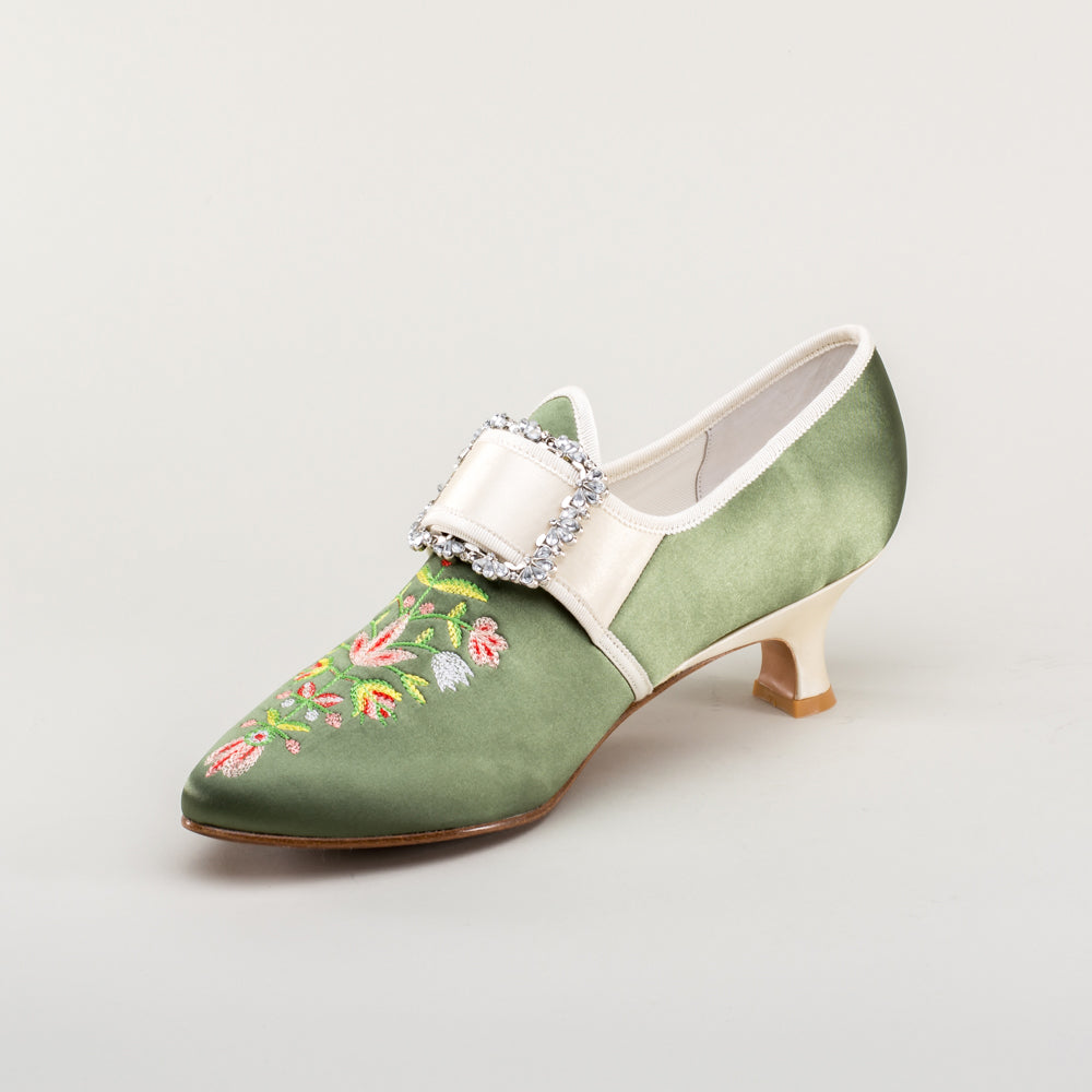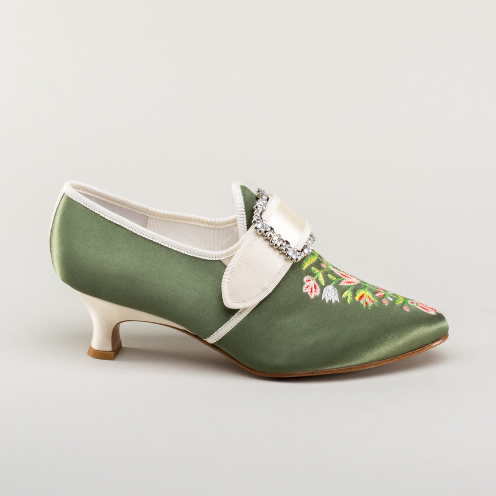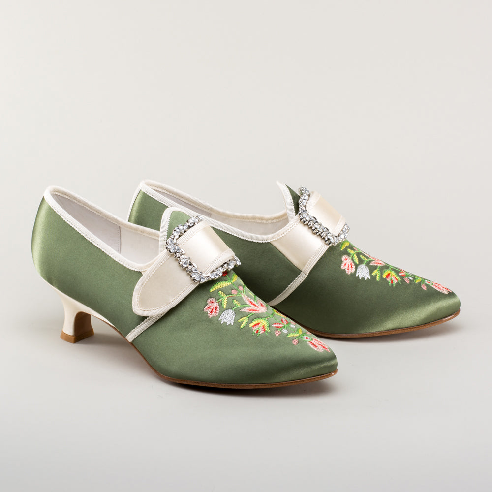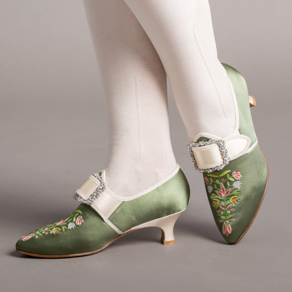 Step back in time with the delicious Primrose 18th century shoes. This authentic embroidered satin design has been recreated in collaboration with The Bata Shoe Museum, capturing the look and feel of the original shoes from 1770s-1790s. Made on the Dunmore last and 2 inch / 5 cm heel, you can be sure that style doesn't mean sacrificing comfort.