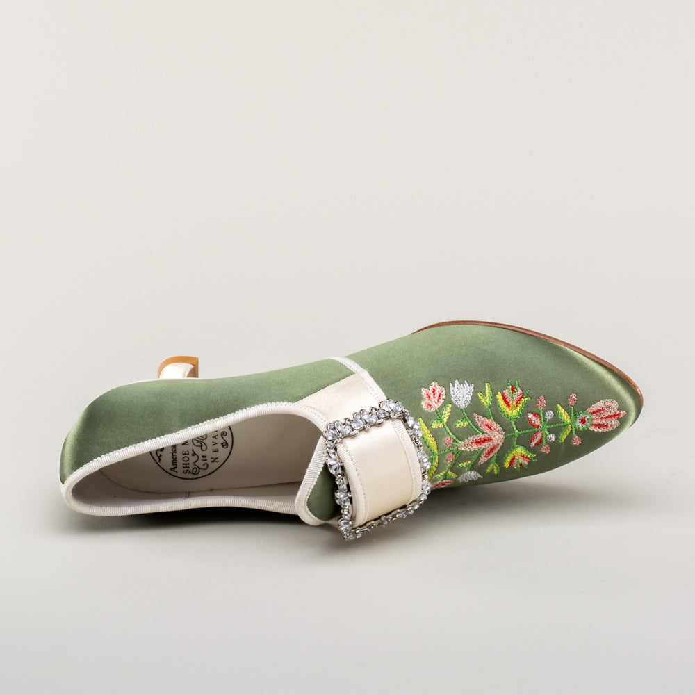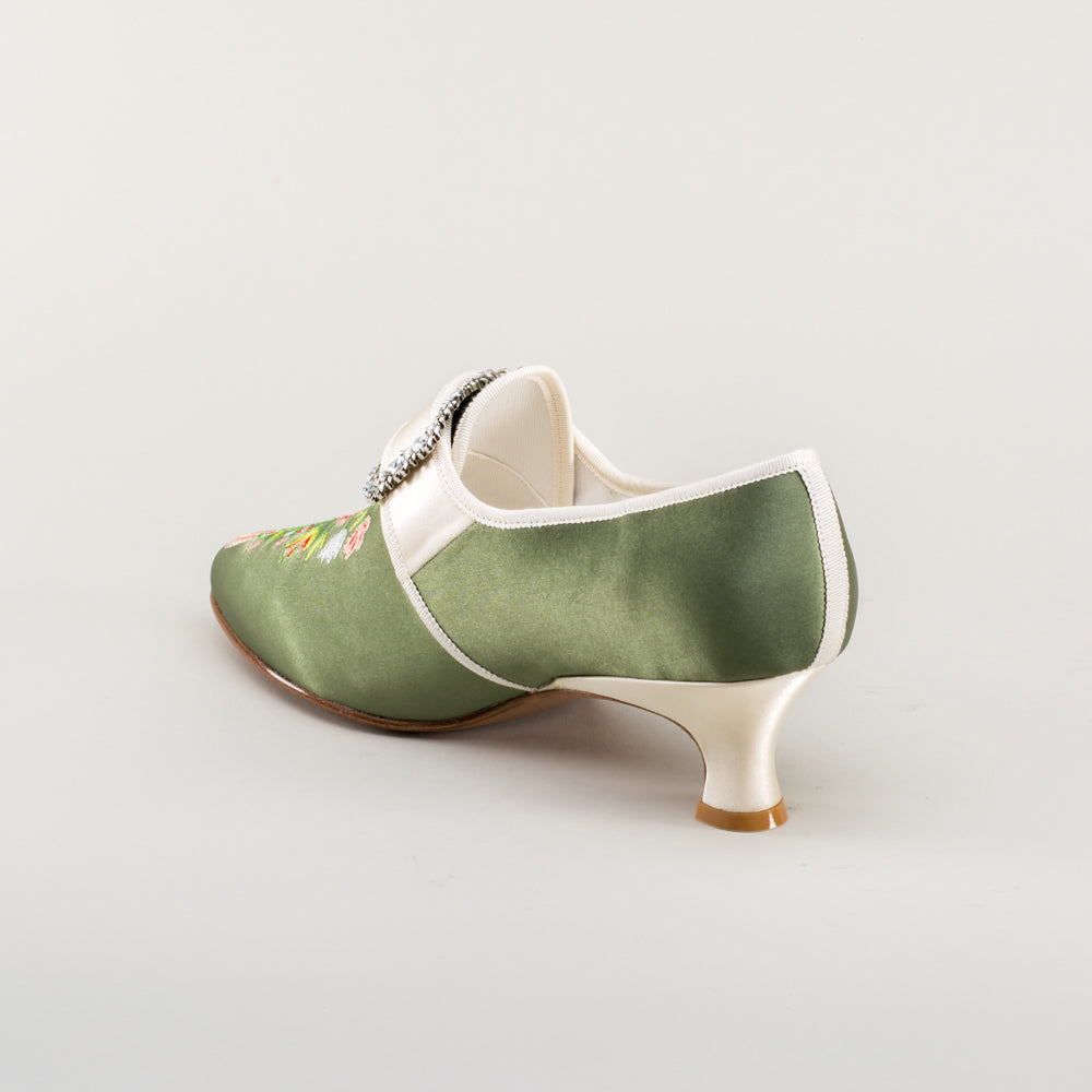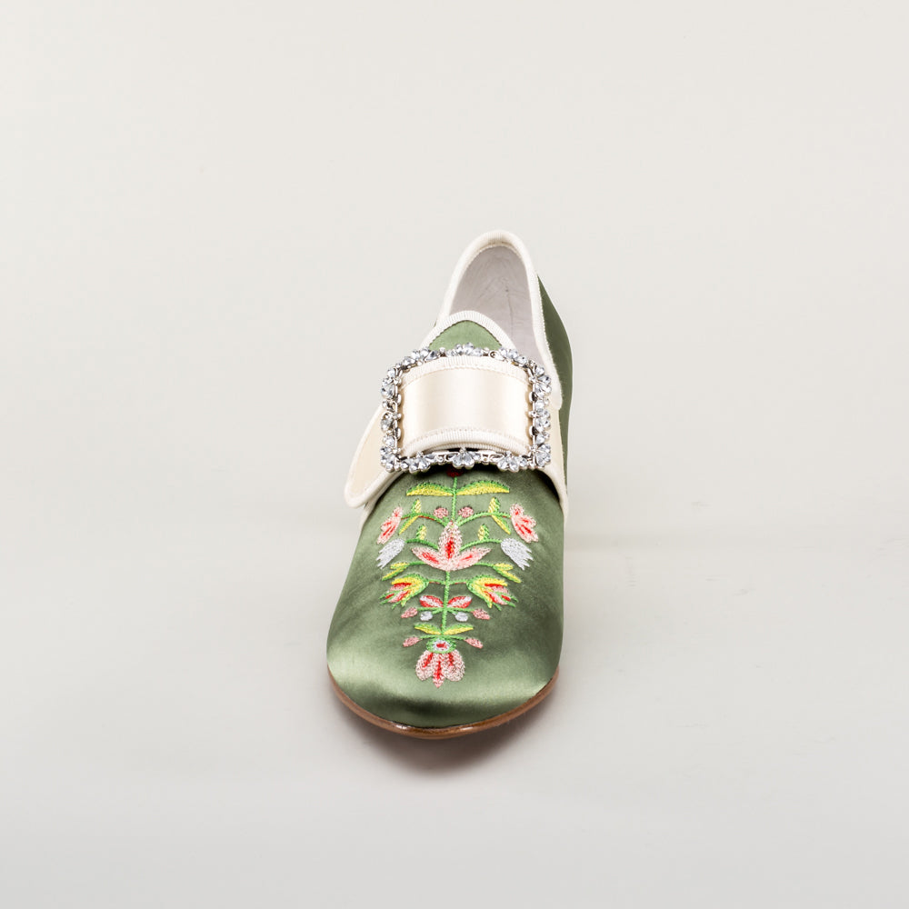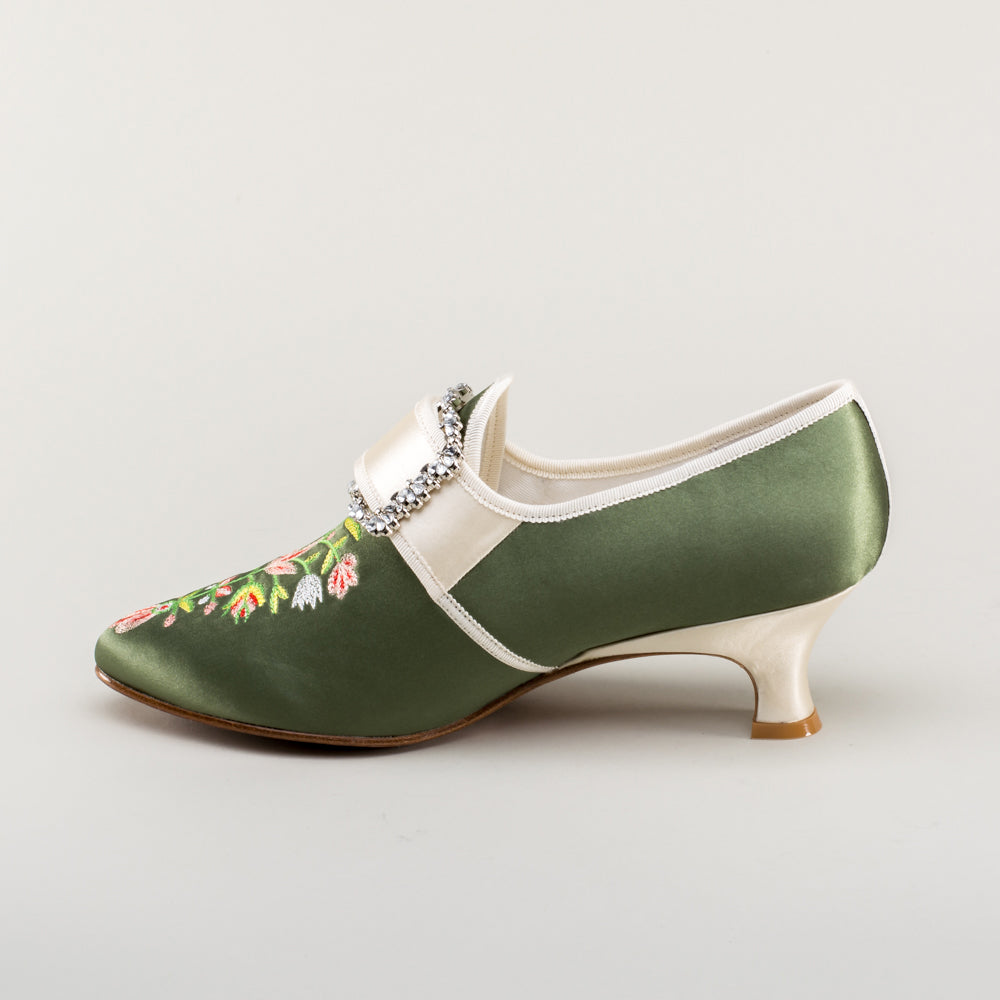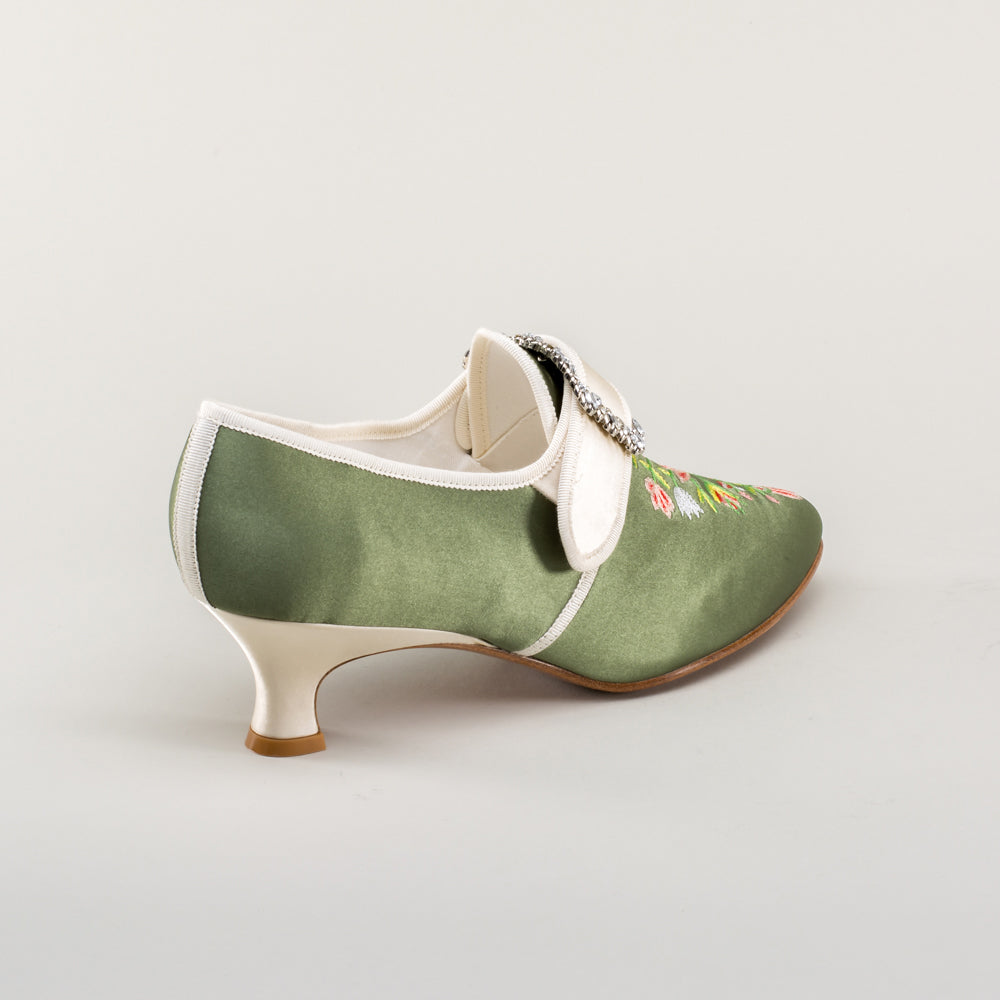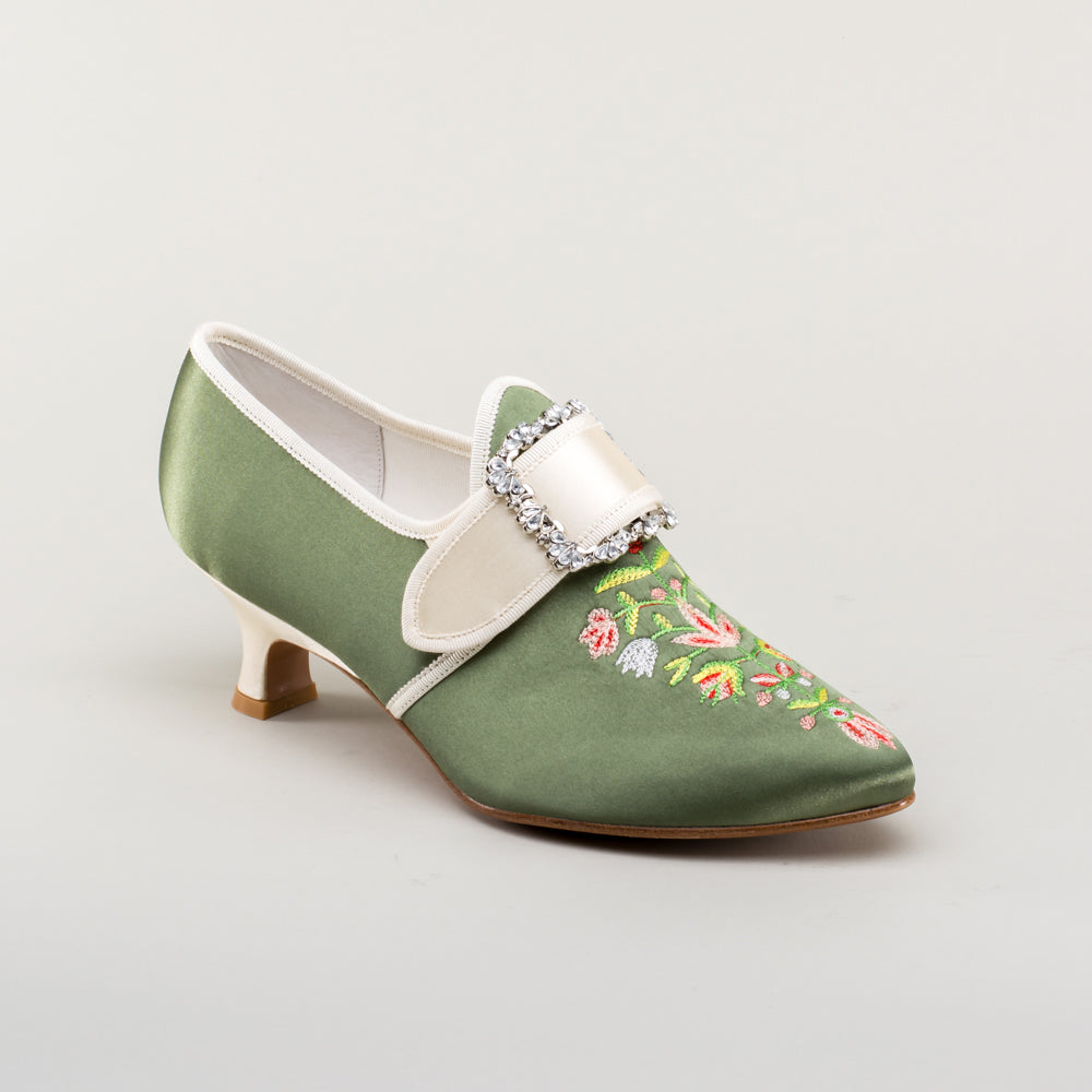 Step back in time with the delicious Primrose 18th century shoes. This authentic embroidered satin design has been recreated in collaboration with The Bata Shoe Museum, capturing the look and feel of the original shoes from 1770s-1790s. Made on the Dunmore last and 2 inch / 5 cm heel, you can be sure that style doesn't mean sacrificing comfort.