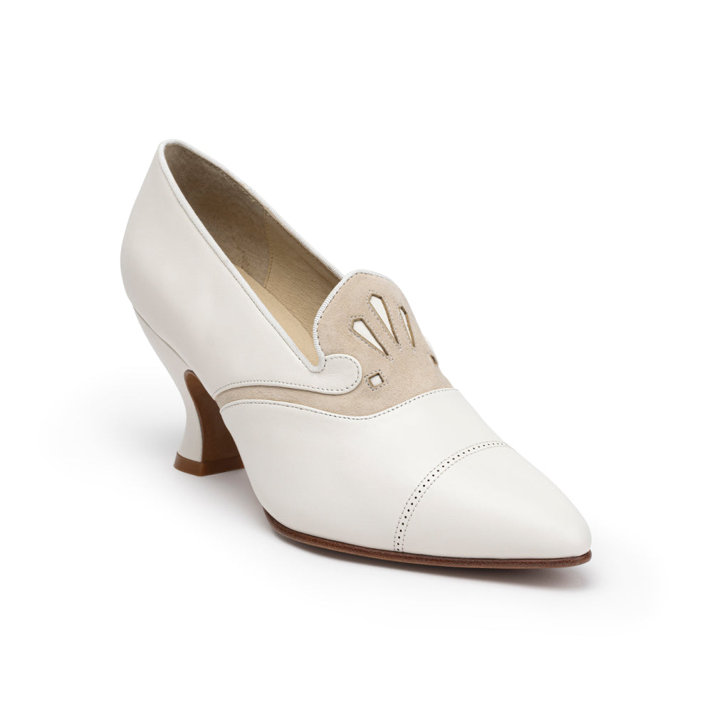 Be utterly beguiling in Elsie Pumps! Meticulously reproduced from period originals, Elsie is accurate to 1890 through 1920. These step-in pumps feature smooth leather and suede uppers in coordinating colors, as well as a distinctive shaped tongue with cutout detailing. Elsie features a custom, perfectly balanced 3”/ 7.6 cm French spool heel, so you can glide across the floor at any soirée. Elsie pairs wonderfully with tea and lingerie gowns as well as evening wear. To keep your Elsies looking spiffy, we recommend pre-treating them with Angelus Water & Stain Repellent.