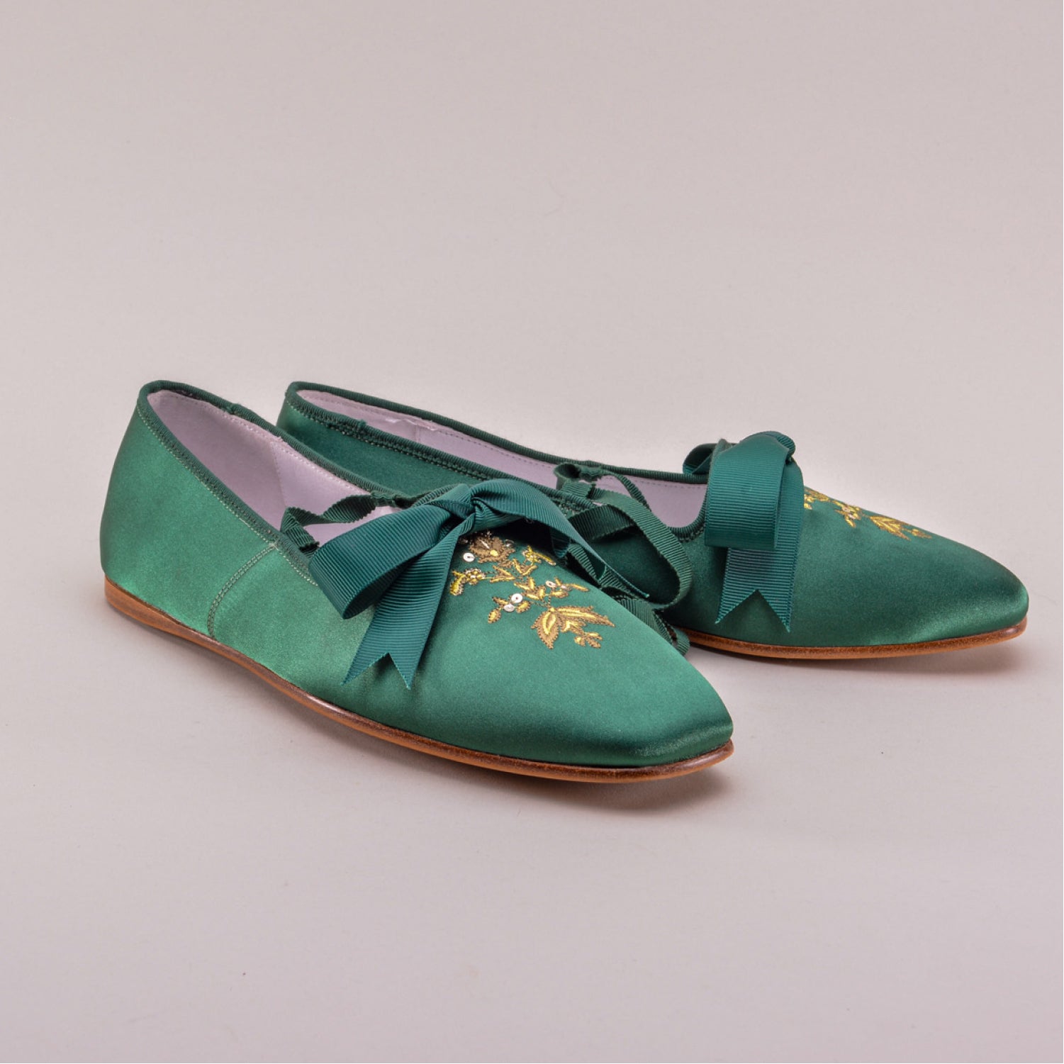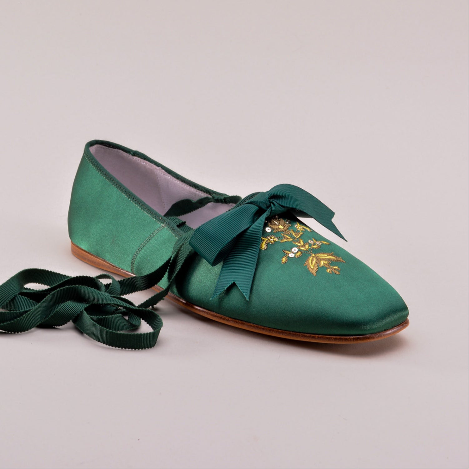 These slip-on shoes are accurate for c. 1800 - 1830. They feature a beautiful satin upper embroidered with a historical design on the vamp, complete with spangles. The edges are bound in petersham, with matching optional ankle ribbons and vamp bow which is easily removed. Period-correct turnshoe construction, soft square toe, and real leather soles make the Penelopes unmatched for evening and formal events where the prettiest of shoes are required. Wear them for Jane Austen, Napoleonic, War of 1812, and all Regency events.